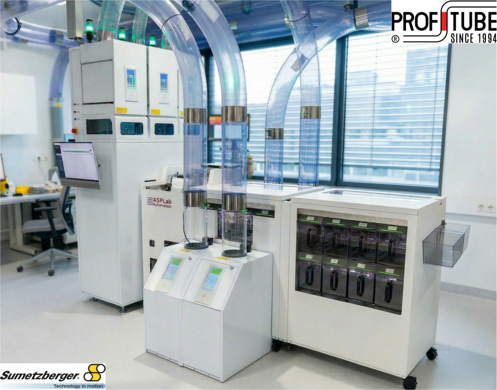 Jako oficjalny dealer marki Sumetzberger, firma PROFITUBE oferuje rozwiązania, które realnie transformują funkcjonowanie laboratoriów. Systemy poczty pneumatycznej Sumetzberger w połączeniu z koncepcją ALL-IN-ONE Laboratory Solution, integrują transport, odbiór, preanalizę, rejestrację, sortowanie oraz dystrybucję próbek w jeden, efektywny proces.